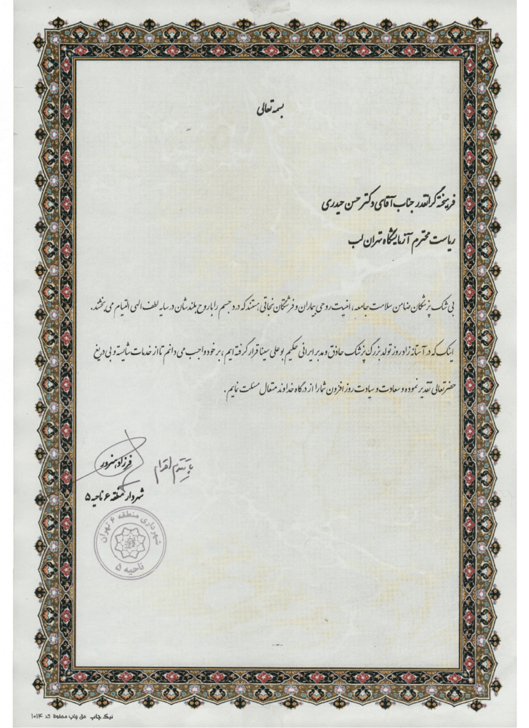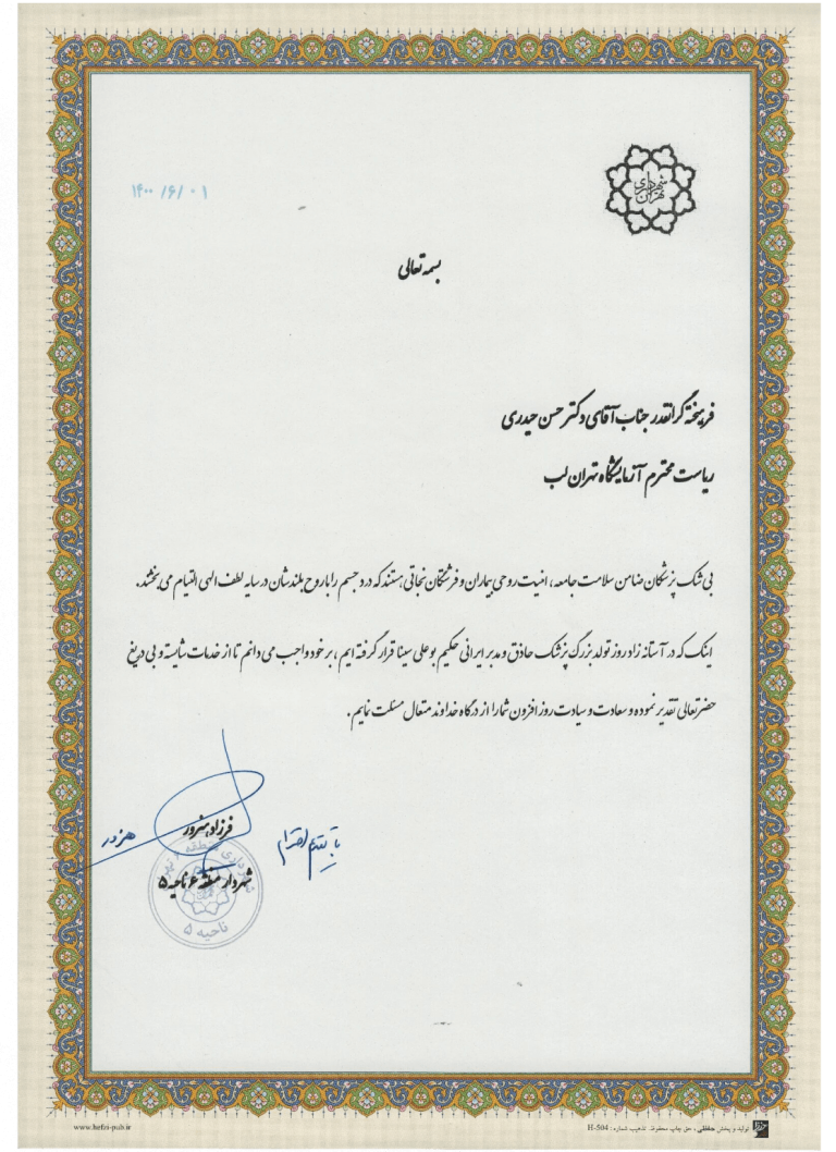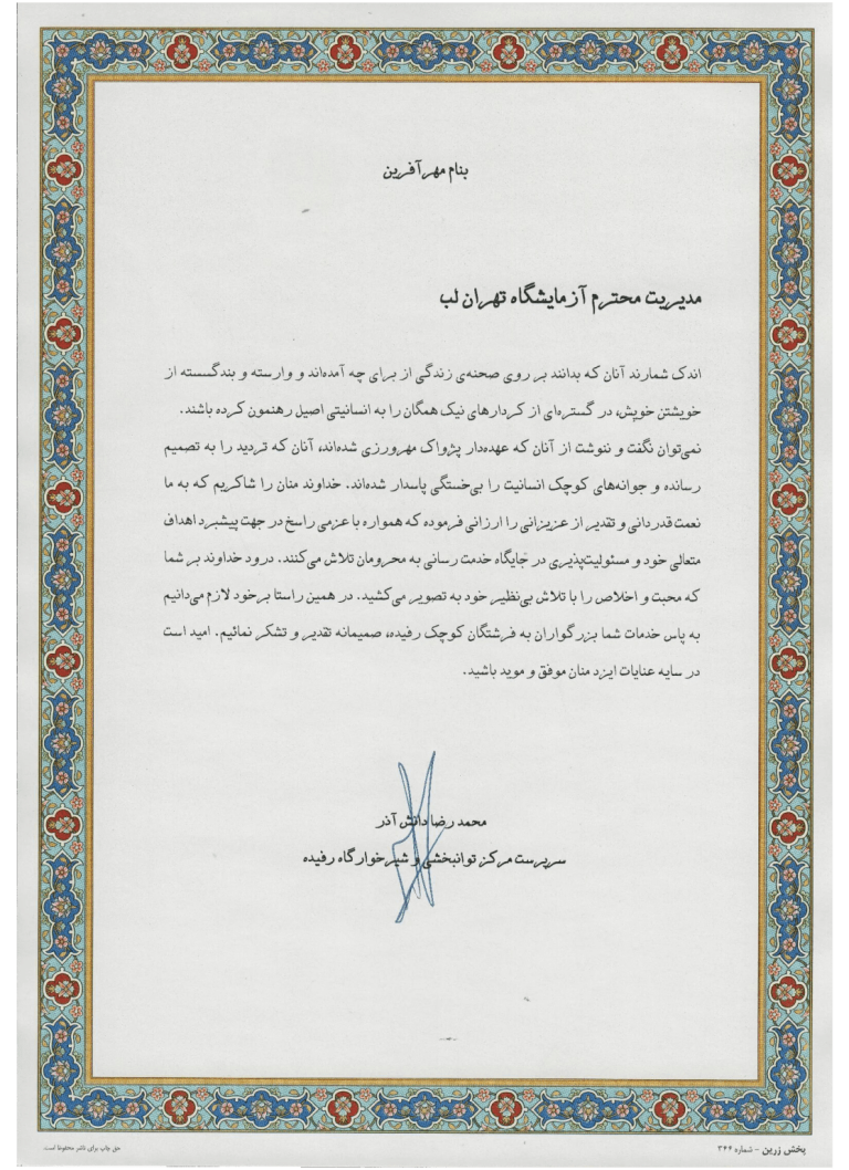 بی شک این امر حاصل تعهد و مسئولیت پذیری بنیان گذاران, سرپرستان و یکایک کارکنان این مجموعه به ارائه و حفظ بالاترین کیفیت خدمات و کسب رضایت مراجعین می باشد.